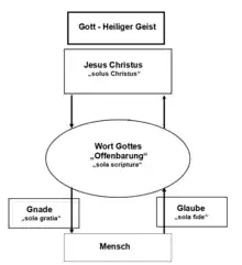 Dans le protestantisme, dont le christianisme évangélique, la grâce et la foi sont intimement liées, car la foi a pour seul but de s'emparer (s'approprier) de ce que la grâce offre gratuitement[6]. La grâce de Dieu est la source de la justification, le sang versé par le Christ en est le fondement, et la foi le moyen qui nous unit au Christ et nous donne d'être justifiés. Dieu justifie celui qui croit, non en raison de la valeur de sa foi, mais en raison de la valeur de celui sur qui elle repose[7].