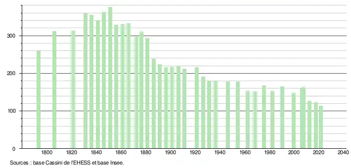 L'évolution du nombre d'habitants est connue à travers les recensements de la population effectués dans la commune depuis 1793. Pour les communes de moins de 10 000 habitants, une enquête de recensement portant sur toute la population est réalisée tous les cinq ans, les populations légales des années intermédiaires étant quant à elles estimées par interpolation ou extrapolation[16]. Pour la commune, le premier recensement exhaustif entrant dans le cadre du nouveau dispositif a été réalisé en 2007[17].