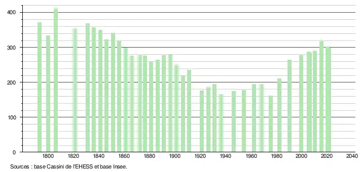 L'évolution du nombre d'habitants est connue à travers les recensements de la population effectués dans la commune depuis 1793. Pour les communes de moins de 10 000 habitants, une enquête de recensement portant sur toute la population est réalisée tous les cinq ans, les populations légales des années intermédiaires étant quant à elles estimées par interpolation ou extrapolation[26]. Pour la commune, le premier recensement exhaustif entrant dans le cadre du nouveau dispositif a été réalisé en 2005[27].