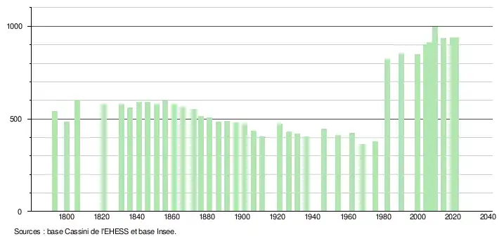 L'évolution du nombre d'habitants est connue à travers les recensements de la population effectués dans la commune depuis 1793. Pour les communes de moins de 10 000 habitants, une enquête de recensement portant sur toute la population est réalisée tous les cinq ans, les populations légales des années intermédiaires étant quant à elles estimées par interpolation ou extrapolation[35]. Pour la commune, le premier recensement exhaustif entrant dans le cadre du nouveau dispositif a été réalisé en 2004[36].