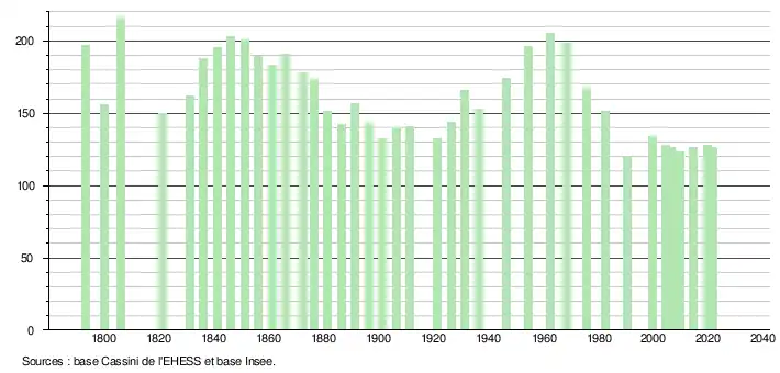 L'évolution du nombre d'habitants est connue à travers les recensements de la population effectués dans la commune depuis 1793. Pour les communes de moins de 10 000 habitants, une enquête de recensement portant sur toute la population est réalisée tous les cinq ans, les populations légales des années intermédiaires étant quant à elles estimées par interpolation ou extrapolation[16]. Pour la commune, le premier recensement exhaustif entrant dans le cadre du nouveau dispositif a été réalisé en 2004[17].