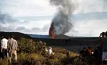 Touristes assistant à l'éruption du Kīlauea Iki en 1959 : la fontaine de lave s'élève au-dessus du cratère (non visible) et construit le cône volcanique du Puʻu Puaʻi (sur sa droite).