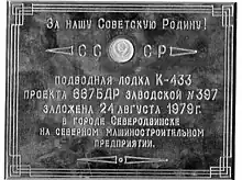 Le , le K-433 est classé en « croiseur sous-marin lance-missiles » (RPK). Sa quille est posée au chantier naval no 50 de la Sevmash à Severodvinsk le , sous le numéro de coque 397. Son premier équipage est formé avec des marins appartenant à la 8e et à la 25e division de sous-marins de la 2e flottille de la Flotte du Pacifique en , le capitaine 2e rang Iouri Petrovitch Gladichev est désigné pour être son premier commandant. Il est alors affecté à la 331e brigade autonome des sous-marins en construction ou en réparations de la Flotte du Nord de la Marine soviétique.