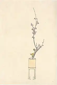 - Le Seika ou shōka (活花 / 生花), "fleur pures"[12], est un arrangement qui consiste en seulement trois parties principales, représentant l'humain, le ciel et la terre. Il s'agit d'une composition simple conçue pour révéler la beauté unique de la plante elle-même. C'est la formalisation du style nageire qui a abouti au style shōka, plus formel.