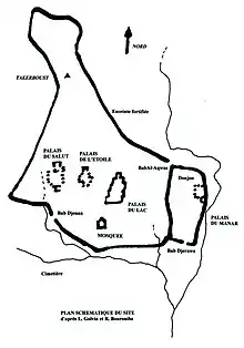 La ville comprenait, à l'intérieur d'une fortification de 7 kilomètres, d'une largeur variant entre 1,20 m et 1,60 m, détruite par la suite par les Almohades, une quantité importante de monuments, parmi lesquels une grande mosquée et son minaret, ainsi que le donjon du Manar, le palais du Manar, le palais du Lac, le palais du Salut, des citernes et bassins. Trois portes, Bab al-Aqwas, Bab Djenan et Bab Djerawa, donnaient accès à la ville, dont seules les deux premières subsistent. Deux monuments émergent encore du sol: le minaret de la mosquée dont on devine assez bien le décor et le donjon du Manar qui domine la falaise de l'oued Fredj.