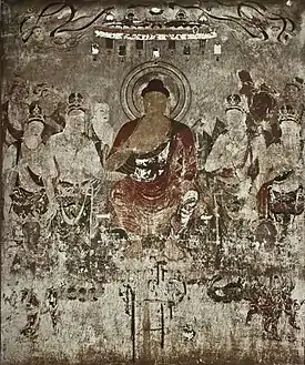 Parmi les fragments de peinture se trouvent la tête d'un des douze généraux célestes et d'un bodhisattva, une cuirasse, des parties d'une robe, des fleurs, des herbes, des pétales de lotus, la partie d'un baldaquin décoré d'une montagne à trois sommets émergeant des nuages, préfigurant les peintures de paysage[1],[7]. Les peintures ont été exécutées sur un rendu de terre, la couche inférieure comprenant de l'argile et de la paille hachée, la couche supérieure du sol plus sableux avec de fines fibres végétales, la surface a été préparée pour la peinture avec un fond d'argile blanche[5]. La gamme de pigments autant que le sujet montrent l'impact de la culture étrangère du continent : contrairement à la palette limitée des tombes décorées avant l'introduction du bouddhisme, les fragments de peintures montrent l'utilisation de vermillon, d'ocre rouge, de minium, d'ocre jaune, de massicot, de malachite, d'azurite, d'argile blanche et de noir de carbone[1],[5],[8].