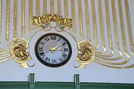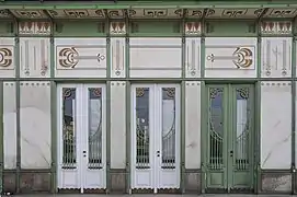 Les façades sont surmontées d'une corniche en forte saillie supportée par de fins corbeaux en fer forgé vert et or, dont la face inférieure est constituée de panneaux de marbre blanc ornés de motifs floraux dorés. Les angles des bâtiments sont coupés et surmontés chacun d'un acrotère en fer forgé percé d'une roue dorée.