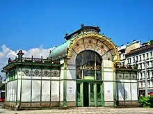 Otto Wagner (1841-1918) fut l'architecte en chef de la Wiener Stadtbahn, un métro urbain léger[2] en grande partie aérien. C'est en 1898 qu'il construisit, avec son élève Josef Maria Olbrich, deux pavillons identiques[2] pour la station de métro qui ouvrit en 1899 sous le nom d'Akademiestraße[3] et qui est maintenant connue sous le nom de Karlsplatz.