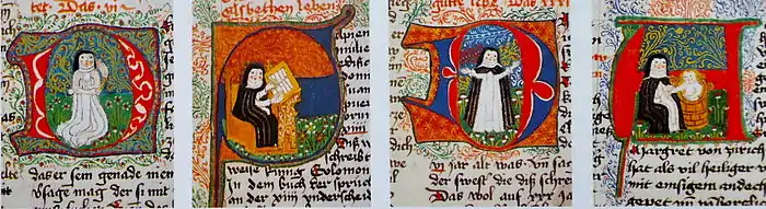 Enfin, elle annonce dans l’explicit qu’elle est entrée au couvent d’Unterlinden alors qu’elle était encore jeune, probablement enfant (« a puericia enutrita hoc opus exegi ») et, dans le prologue, qu’elle écrit le Schwesternbuch à un âge avancé (« iam senescens… propriis manibus oculisque caligantibus »)[8].