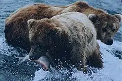 Katmai est également bien connu pour l'observation des ours bruns d'Alaska pêchant le saumon rouge dans la rivière[6].