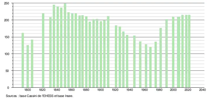 L'évolution du nombre d'habitants est connue à travers les recensements de la population effectués dans la commune depuis 1793. Pour les communes de moins de 10 000 habitants, une enquête de recensement portant sur toute la population est réalisée tous les cinq ans, les populations légales des années intermédiaires étant quant à elles estimées par interpolation ou extrapolation[18]. Pour la commune, le premier recensement exhaustif entrant dans le cadre du nouveau dispositif a été réalisé en 2007[19].