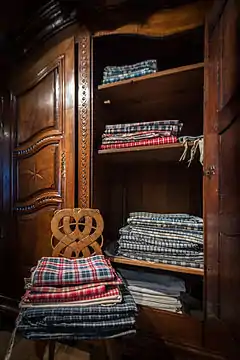 Après l'oreiller, l’édredon, pièce caractéristique de la literie des pays germaniques, est lui aussi recouvert d’une housse en kelsch. Les exemplaires conservés et les représentations iconographiques attestent que ce tissu n’est utilisé que pour la partie visible de la literie[8]. La face inférieure de l’oreiller et de l’édredon est faite de lin écru ou de coton blanc uni, les fils blancs étant moins chers que les fils de couleur. Deux rubans de lin ou de coton sont cousus de chaque côté de l’ouverture de la housse et servent à la fermer autour de l’édredon ou de l’oreiller de plume. Le linge de lit en kelsch fait partie du trousseau de la future mariée, qui y brode ses initiales au fil rouge, parfois aussi un chiffre de 1 à 12, un trousseau de mariage complet comprenant une douzaine d’exemplaires de chaque type de linge[9]. Celui-ci est ensuite empilé dans le coffre ou l’armoire de mariage, où chaque housse en kelsch se trouve maintenue pliée grâce à quelques points cousus avec du gros fil.