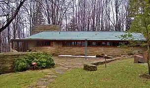Inspirée entre autres de la maison sur la cascade, Walker House, Sol Friedman House et de son village Usonia Historic District (en) (à 40 km au nord de New York) cette villa usonia de 210 m2 est construite sur un terrain à forte pente, en béton, pierre de taille apparente, bois de cyprès, fenêtres à ossatures métalliques, toit en cuivre vert-de-gris, vastes baies vitrées avec vue panoramique sur terrain arboré, terrasse, et nombreux meubles intégrés de Wright[5]...