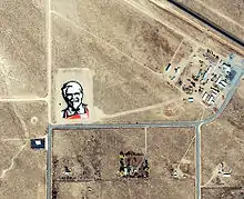 En 2006, KFC crée une gigantesque enseigne publicitaire dans le désert du Nevada, d'après leur service publicitaire « la plus grande jamais construite à ce jour » (il s'agirait en réalité d'un logo Readymix réalisé en 1965 dans le désert australien[22]). D'une superficie totale de 8 128,75 m2, le nouveau logo de la chaîne est visible depuis l'espace grâce au satellite GeoEye situé à plus de 250 km d'altitude[23]. Avec 3 000 heures de travail, la réalisation consista surtout à poser côte à côte des carrés peints de 30 cm de côté, comme un gigantesque puzzle. Le tout se chiffre alors ainsi : 6 000 pièces rouges, 14 000 carrés blancs (sur fond blanc), 12 000 jaunes, 5 000 beiges et 28 000 noirs[24]. À quelques kilomètres seulement du fameux site 51, cette enseigne aux proportions démesurées est censée marquer un renouveau de la marque qui prévoit la rénovation de ses 14 000 unités au cours des 5 prochaines années[25]