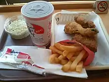 En plus du poulet frit, KFC propose dans son menu des plats d'accompagnement. On peut par exemple commander dans les restaurants américains du coleslaw à la mayonnaise, de la purée de pommes de terre, des pâtisseries, des épis de maïs, des tourtes, des hamburgers, des travers de porc, des haricots verts, des ailes de poulet, des Poulet Pop-Corn (bouchées de poulet frit servies dans un cornet en carton), des sandwichs et des desserts[12]. En revanche, la carte de la chaine est moins diversifiée dans les autres pays du monde.