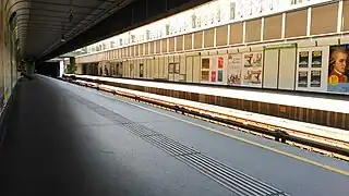L'entrée est surmontée d'un auvent en fer forgé en forte saillie peint en couleur vert pomme, une caractéristique commune à toutes les stations de la Stadtbahn réalisées par Otto Wagner[13]. Cet auvent est porté par deux hautes colonnes en fer forgé ajouré s'élançant d'un socle de pierre calcaire discrètement relié aux soubassements latéraux. Ornées à leur sommet d'une couronne de laurier, ces colonnes portent par de fins corbeaux en fer forgé l'auvent vert sous lequel s'abrite une frise de feuilles de laurier, de roses et de rubans. Au-dessus de l'auvent, orné de palmettes, on aperçoit le corps central de la station, de forme carrée, orné sur chaque face d'un entablement en maçonnerie composé d'une architrave ornée d'un large cartouche aveugle flanqué de deux petits cartouches sculptés, d'une frise de perles et d'une petite corniche. Ce corps central est marqué à chaque angle d'une cheminée.