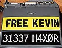 - Son arrestation a conduit à une vague de cybermanifestations orchestrées par le site anglais Free Kevin Mitnick[15]. Des fans ont même publié des autocollants « Free Kevin (« Libérez Kevin ») »[15].