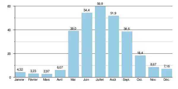 Le débit moyen mensuel observé en mars (minimum annuel d'étiage) atteint 2,97 m3/s, soit plus ou moins 5 % du débit moyen du mois de juillet (59,8 m3/s). L'amplitude des variations saisonnières peut être qualifiée de relativement modérée, du moins dans le contexte des cours d'eau sibériens. Sur la période d'observation de 58 ans, le débit mensuel minimal a été de 0,60 m3/s en , tandis que le débit mensuel maximal s'est élevé à 178 m3/s en . Quant à la période libre de glaces (de mai à septembre), le débit mensuel minimal observé se montait à 17,2 m3/s en , ce qui restait très appréciable.