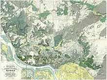 La ville de Kiev a une superficie de 827 km2. Elle est au centre d'une agglomération de 12 300 km² et d'une aire urbaine de 28 900 km². La ville de Kiev peut être découpée en plusieurs secteurs concentriques[4] :