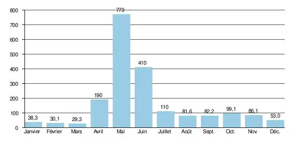 Le débit moyen mensuel observé en mars (minimum d'étiage) est de 29,3 m3/s, soit un peu moins de 4 % du débit moyen du mois de mai (773 m3/s), ce qui souligne l'amplitude très élevée des variations saisonnières, même dans le contexte sibérien où les écarts sont souvent très importants. Ces écarts de débit mensuel peuvent encore être plus marqués d'après les années : sur la durée d'observation de 40 ans, le débit mensuel minimal a été de 9,75 m3/s en , tandis que le débit mensuel maximal s'élevait à 1 120 m3/s en .