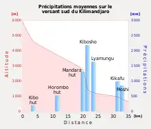Les conditions climatiques varient en fonction des versants du Kilimandjaro. Ainsi, sur le versant méridional, il tomberait 850 millimètres de précipitations par an à Moshi à 800 mètres d'altitude, 992 millimètres à Kikafu à 960 mètres d'altitude, 1 663 millimètres à Lyamungu à 1 230 mètres d'altitude et 2 184 millimètres à Kibosho à 1 479 mètres d'altitude tandis que sur le versant oriental, il tomberait 1 484 millimètres à Mkuu à 1 433 mètres d'altitude ; ces données sont toutefois à prendre avec précaution en raison des différentes méthodes utilisées. Le pic altitudinal de précipitations se situerait entre 2 400 et 2 500 mètres d'altitude sur le versant méridional et n'est pas encore déterminé sur les autres versants. Au-delà, le modèle pluviométrique se complexifie avec l'apparition de précipitations par contact, qualifiées de « néphéléniques », au niveau des forêts puis une très nette diminution[21] avec 1 300 millimètres au refuge Mandara à 2 740 mètres d'altitude, 525 millimètres au refuge Horombo à 3 718 mètres d'altitude et moins de 200 millimètres par an au refuge Kibo au-dessus de 4 630 mètres d'altitude[40]. Les échanges par convection qui constituent le cycle de l'eau entre les différents étages de végétation du Kilimandjaro sont très importants sur le plan bioclimatique[21].