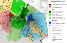 Le volcanisme du Kilimandjaro débute au cours du Pliocène ; la construction de son édifice se serait déroulée en quatre grandes phases, durant lesquelles ont été émis 5 000 km3 de roches volcaniques[25]. Les trois dernières ont formé les stratovolcans imbriqués qui constituent le Shira, le Kibo et le Mawenzi. Le rift orienté ouest-nord-ouest—est-sud-est qui les traverse a également donné naissance à de nombreux cônes satellites, répartis en approximativement huit zones. Quelques bouches éruptives situées au sommet semblent avoir été actives pendant l'Holocène[8].