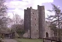 Un donjon a été construit pour renforcer ou remplacer les défenses antérieures au XVe siècle. Cette structure rectangulaire de cinq niveaux contient quatre étages au-dessus d'un sous-sol voûté en berceau avec une deuxième voûte au-dessus du quatrième étage[44],[45]. Il est attenant au sud-ouest à une guérite et était à l'origine attenant à un mur défensif (bawn)[46]. Le Dublin Penny Journal montre une maison à pignons escarpés attenante à la guérite, peut-être de la fin du XVIIe siècle ou du début du XVIIIe siècle[47] Un boulet de canon, datant peut-être du XVIIe siècle, a été récupéré près du château en 1901[48].