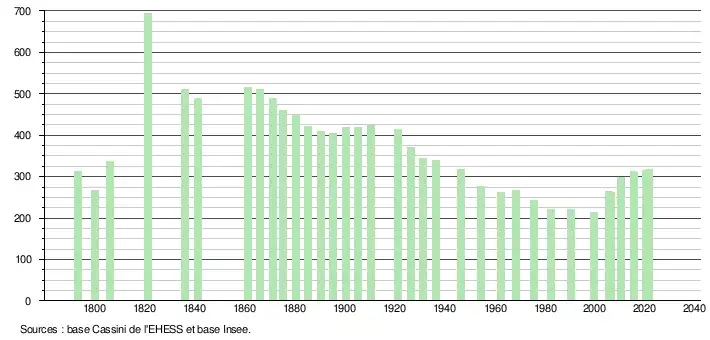 L'évolution du nombre d'habitants est connue à travers les recensements de la population effectués dans la commune depuis 1793. Pour les communes de moins de 10 000 habitants, une enquête de recensement portant sur toute la population est réalisée tous les cinq ans, les populations légales des années intermédiaires étant quant à elles estimées par interpolation ou extrapolation[15]. Pour la commune, le premier recensement exhaustif entrant dans le cadre du nouveau dispositif a été réalisé en 2005[16].