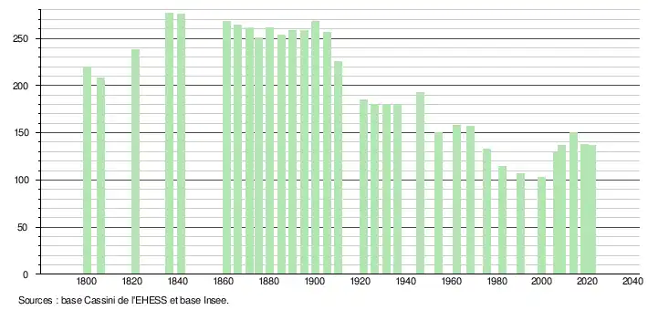 L'évolution du nombre d'habitants est connue à travers les recensements de la population effectués dans la commune depuis 1800. Pour les communes de moins de 10 000 habitants, une enquête de recensement portant sur toute la population est réalisée tous les cinq ans, les populations légales des années intermédiaires étant quant à elles estimées par interpolation ou extrapolation[17]. Pour la commune, le premier recensement exhaustif entrant dans le cadre du nouveau dispositif a été réalisé en 2008[18].