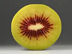 - Red Passion : variété de kiwi à cœur rouge développée en Italie, à peau lisse et à chair dorée associée à un goût de fruits rouges[29].