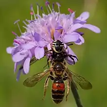 La chenille du papillon de nuit Adèle de la scabieuse se nourrit des capitules de la Knautie des champs de même que celles du Tortricidae Cochylis flaviciliana et du Pterophoridae Stenoptilia bipunctidactyla[9]. Les chenilles des papillons de la famille des Tortricidae Endothenia oblonganan, Agapeta zoegana, Aethes hartmanniana et Selenodes karelica sont spécialisées dans les racines[9]. Quant aux larves des coléoptères de la famille des Cerambycidae, Agapanthia violacea, Agapanthia intermedia et Agapanthia suturalis, ce sont les tiges qu'elles apprécient[9].