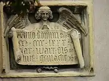 Le bâtiment le plus au nord comporte deux étages surmontés de hauts pignons, chantourné à l'ouest, rectiligne à l'est. Au premier étage, les baies sont munies de pilastres à masques humains[3].