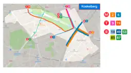 En 2012, outre les lignes 2 et 6 du métro et la réouverture du trafic SNCB à la gare de Simonis, la commune de Koekelberg est desservie par la ligne de tramway 19 et les bus 13, 14, 15, 20, 87 et N16 de la STIB (Société des transports intercommunaux de Bruxelles), et par les lignes de bus 129, 212, 213, 214 et 355 de la société régionale De Lijn.