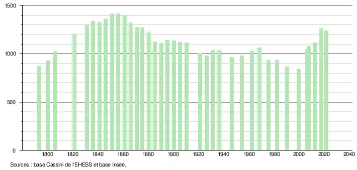 L'évolution du nombre d'habitants est connue à travers les recensements de la population effectués dans la commune depuis 1793. Pour les communes de moins de 10 000 habitants, une enquête de recensement portant sur toute la population est réalisée tous les cinq ans, les populations légales des années intermédiaires étant quant à elles estimées par interpolation ou extrapolation[23]. Pour la commune, le premier recensement exhaustif entrant dans le cadre du nouveau dispositif a été réalisé en 2007[24].