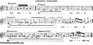 Cette figure prévaut tout au long de la prière, dans toutes ses variantes. Le motif original de ces phrases semble être l'accord de mélodie si fréquemment répété dans les versions modernes du Kol Nidre lors de l'introduction de chaque répétition (cinq fois de manière consécutive dans la première phrase du texte dans la tradition italienne et, de façon un peu plus élaborée, quatre fois de suite à partir des mots nidrana lo nidre dans le rite allemand).