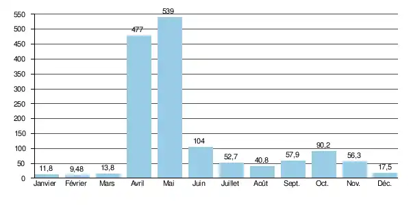 En ce qui concerne la période libre de glaces (de mai à octobre inclus), le débit mensuel minimum observé a été de 9,83 m3/s en [2].