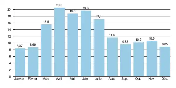 Le minimum d'étiage est observé en janvier, avec un débit de 8,37 m3/s, tandis que le débit mensuel maximal est celui du mois d'avril avec 20,5 m3/s en moyenne. Les variations saisonnières sont donc fort peu importantes, et le fleuve apparaît comme régulier. Sur la durée d'observation de 57 ans, le débit mensuel maximal a été de 74,2 m3/s en . Un débit mensuel supérieur à 50 m3/s est exceptionnel.