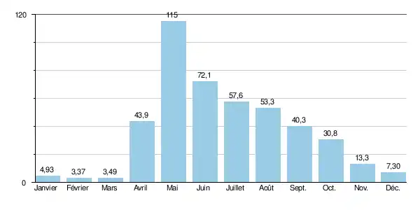 Le débit moyen mensuel observé en février (minimum d'étiage) est de 3,37 m3/s, soit moins de 3 % du débit moyen du mois de mai (115 m3/s), ce qui souligne l'amplitude importante des variations saisonnières. Ces écarts de débit mensuel peuvent encore être plus marqués d'après les années. Ainsi sur la durée d'observation de 33 ans, le débit mensuel minimal relevé a été de 0,73 m3/s en , tandis que le débit mensuel maximal s'élevait à 267 m3/s en et en .