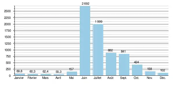 En ce qui concerne la période libre de glaces (de juin à septembre inclus), le débit mensuel minimum observé a été de 269 m3/s en , ce qui restait encore fort appréciable.