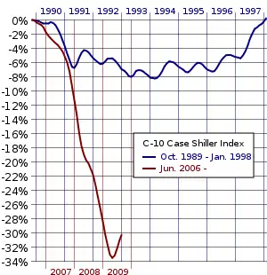 Le marché immobilier commençant à ralentir en hiver 2005 jusqu'à l'été 2006[33],[34], l'économiste en chef de l'association des agents immobiliers américains (NAR), David Lereah a prédit un atterrissage en douceur pour le marché[35]. Néanmoins, la montée sans précédent du stock de biens immobiliers à vendre et l'atterrissage du marché en 2006, l'économiste en chef des agents californiens, Leslie Appleton-Young ne partageait pas le terme d'atterrissage en douceur afin de qualifier le marché californien[36]. Le Financial Times a mis en garde sur l'effet sur l'économie très proche de l'atterrissage en douceur, déclarant qu'un ralentissement dans ces marchés bouillants étaient inévitable. « Le ralentissement sera peut-être léger mais il est malgré tout impossible d'exclure une implosion de la confiance et des prix.… Si la richesse issue de l'accroissement des prix de l'immobilier… l'effet sur l'économie mondiale sera dépressif »[37]. Il est difficile d'appeler différemment la situation des promoteurs autre qu'un atterrissage dur a déclaré le pdg de Toll Brothers (en), le principal constructeur de maisons de luxe[38]. Angelo Mozilo le pdg du courtier en prêt subprimes, Countrywide Financial, a également fait observé « qu'il n'avait jamais vu un atterrissage en douceur en 53 ans, et qu'il y avait beaucoup de chemin avant d'atteindre le fond... »[39]. À la suite de ces rapports, Lereah a admis qu'il s'attendait également à « une baisse des prix nationale de 5 % », et davantage dans certaines villes comme la Floride et la Californie[40]. Les volumes de ventes et les prix au niveau national s'effondrent en selon les données de la NAR, avec des ventes en baisse de 13 % de 482 000 par rapport au sommet de 554 000 en ; le prix médian étant en baisse de 6 % de 217 000 $ par rapport au sommet de 230 200 $ en . Le plongeon au niveau de l'ancien est le plus abrupt depuis 1989 [réf. nécessaire]. Le marché du neuf souffre également beaucoup. La baisse la plus importante en glissement annuel au niveau du prix médian depuis 1970 a eu lieu en avec une baisse de 10,9 % selon le département du Commerce[41].