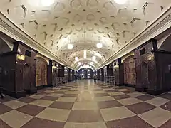Dessinée par les architectes I. Fomine et N.N. Andrikanis, elle a des murs carrelés gris-blanc et des piliers recouverts de marbre géorgien de Shrosha, de couleur rouge foncé. C'est une station à quatre étages souterrains, l'un des deux supérieurs étant le premier à utiliser un design à trois arches et trois tunnels parallèles cylindriques. Dans ce type de station, les tubes extérieurs (abritant les rails et les plates-formes) sont séparés du hall central, plus large, par d'imposants piliers. Elle dispose d'un bâtiment extérieur en forme de coquillage, dessiné par N.A. Ladovski, situé du côté sud de Sadovoïe Koltso, le boulevard périphérique "B" de Moscou.