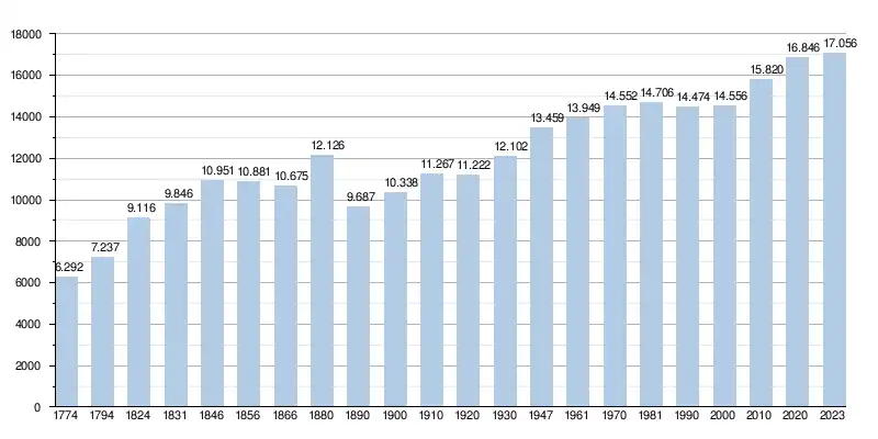 Elle comptait, au , 16 869 habitants (8 349 hommes et 8 520 femmes), soit une densité de 504,76 habitants/km²[4] pour une superficie de 33,42 km².