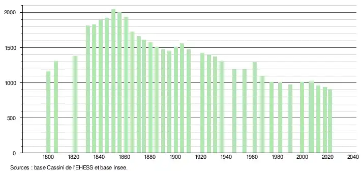 L'évolution du nombre d'habitants est connue à travers les recensements de la population effectués dans la commune depuis 1800. Pour les communes de moins de 10 000 habitants, une enquête de recensement portant sur toute la population est réalisée tous les cinq ans, les populations légales des années intermédiaires étant quant à elles estimées par interpolation ou extrapolation[21]. Pour la commune, le premier recensement exhaustif entrant dans le cadre du nouveau dispositif a été réalisé en 2007[22].