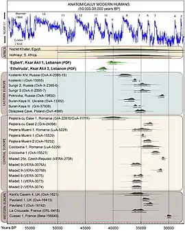 - Les niveaux XXXII et XXVI sont du Moustérien ; le niveau XXXII a été daté par le carbone 14 de 51 000 ans-49 000 ans avant le présent, le niveau XXVI de 47 000 ans AP[3]. Ces niveaux du Paléolithique moyen sont caractérisés par l'application des méthodes Levallois[3].