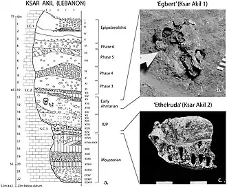 Ksar Akil (Ksar 'Akil, ou Ksar Aqil[1]) est un site préhistorique du Paléolithique au Liban, à 10 km au nord-est de Beyrouth. Les restes d'un Homo sapiens surnommé « Egbert » et d'un Homo sapiens archaïque surnommé « Ethelruda » y ont été découverts dans les années 1930-1940, de même que des milliers d'outils en pierre, des coquillages ayant servi de parure, et des os d'animaux brisés. Le fossile humain le plus ancien mis au jour dans ce grand abri sous roche (Ethelruda) a été daté de 42 000 ans avant le présent, en 2013[2]. Ksar Akil est considéré comme un site majeur pour la connaissance de la phase initiale du Paléolithique supérieur au Levant[3].