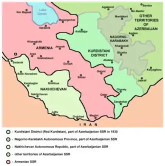 Le , l'ouïezd du Kurdistan fut dissous. Le , un okroug (région) du Kurdistan le remplaça. Cet okroug incluait, outre le territoire de l'ex-ouïezd, tout le raïon (district) de Zangilan et une partie de celui de Jabrayil. Cependant, en raison des protestations du ministère soviétique des Affaires étrangères, qui était préoccupé par la détérioration des relations avec la Turquie et l'Iran en cas de soutien affiché aux mouvements nationalistes kurdes, l'okroug fut liquidé le . À la fin des années 1930, les autorités soviétiques déportèrent une part importante de la population kurde d'Azerbaïdjan et d'Arménie vers le Kazakhstan, les Kurdes de Géorgie furent quant à eux victimes des purges staliniennes de 1944[2].