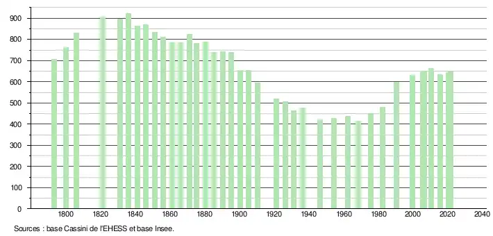 L'évolution du nombre d'habitants est connue à travers les recensements de la population effectués dans la commune depuis 1793. Pour les communes de moins de 10 000 habitants, une enquête de recensement portant sur toute la population est réalisée tous les cinq ans, les populations légales des années intermédiaires étant quant à elles estimées par interpolation ou extrapolation[21]. Pour la commune, le premier recensement exhaustif entrant dans le cadre du nouveau dispositif a été réalisé en 2005[22].