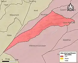 Le retrait-gonflement des sols argileux est susceptible d'engendrer des dommages importants aux bâtiments en cas d’alternance de périodes de sécheresse et de pluie. La totalité de la commune est en aléa moyen ou fort (88,8 % au niveau départemental et 48,5 % au niveau national). Sur les 133 bâtiments dénombrés sur la commune en 2019, 133 sont en aléa moyen ou fort, soit 100 %, à comparer aux 98 % au niveau départemental et 54 % au niveau national. Une cartographie de l'exposition du territoire national au retrait gonflement des sols argileux est disponible sur le site du BRGM[24],[Carte 3].