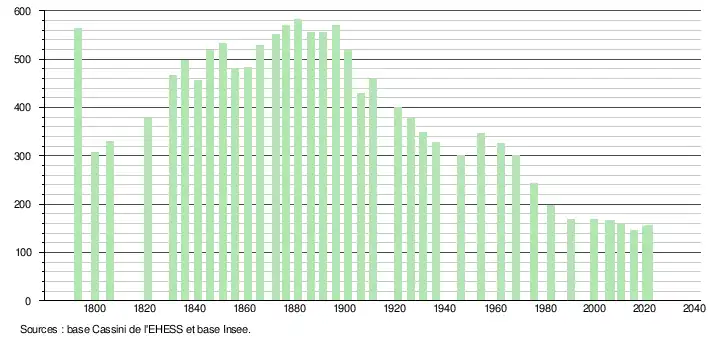 | L'évolution du nombre d'habitants est connue à travers les recensements de la population effectués dans la commune depuis 1793. Pour les communes de moins de 10 000 habitants, une enquête de recensement portant sur toute la population est réalisée tous les cinq ans, les populations légales des années intermédiaires étant quant à elles estimées par interpolation ou extrapolation[29]. Pour la commune, le premier recensement exhaustif entrant dans le cadre du nouveau dispositif a été réalisé en 2005[30]. En 2021, la commune comptait 156 habitants[Note 5], en augmentation de 6,85 % par rapport à 2015 (Tarn : +1,82 %, France hors Mayotte : +1,84 %). |