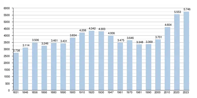 Les chiffres des années 1831 à 1970 tiennent compte des chiffres des anciennes communes fusionnées.
